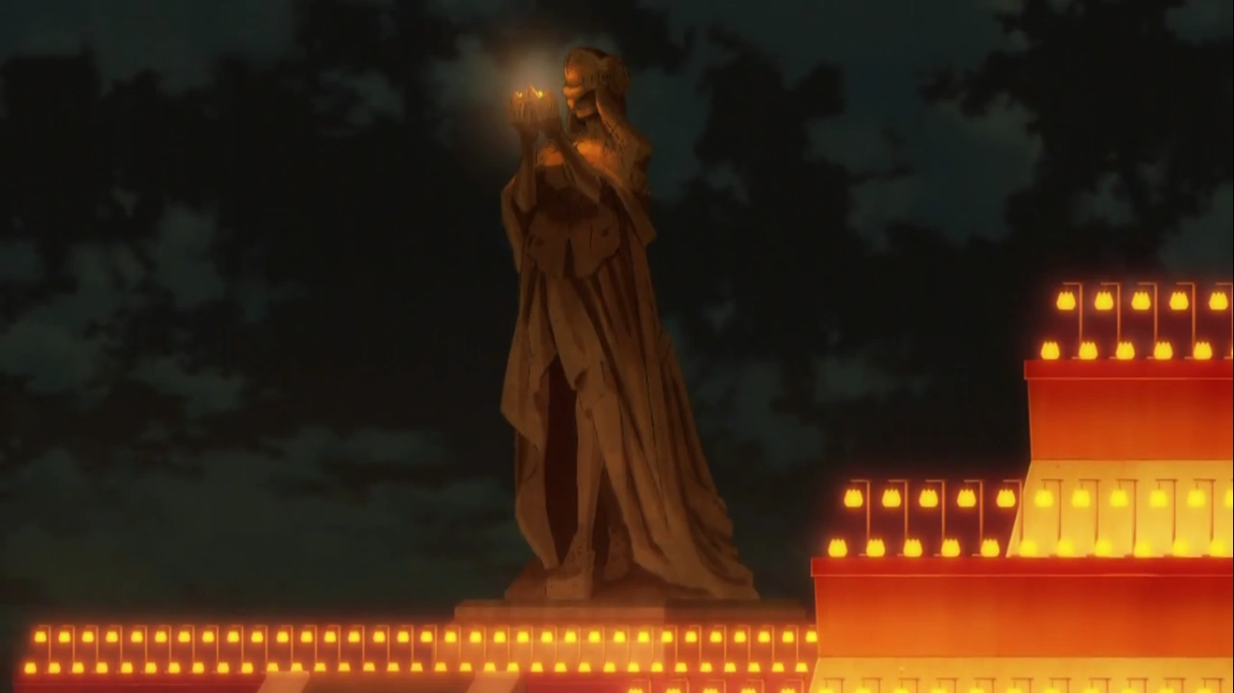 The warriors prove their worth in front of a statue of The Goddess in the Temple of Fate, and if they are chosen they receive a Crest of Six Flowers.